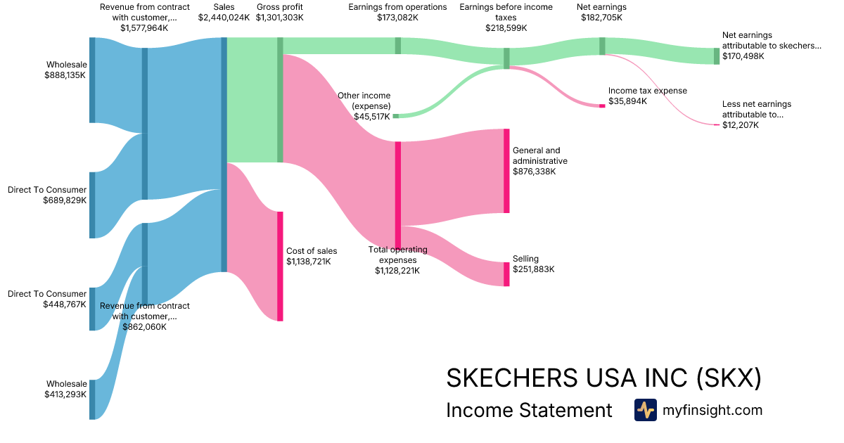 For the quarter ending 2025-06-30, SKX made $2,440,024K in revenue. $170,498K in net income. Net profit margin of 6.99%.