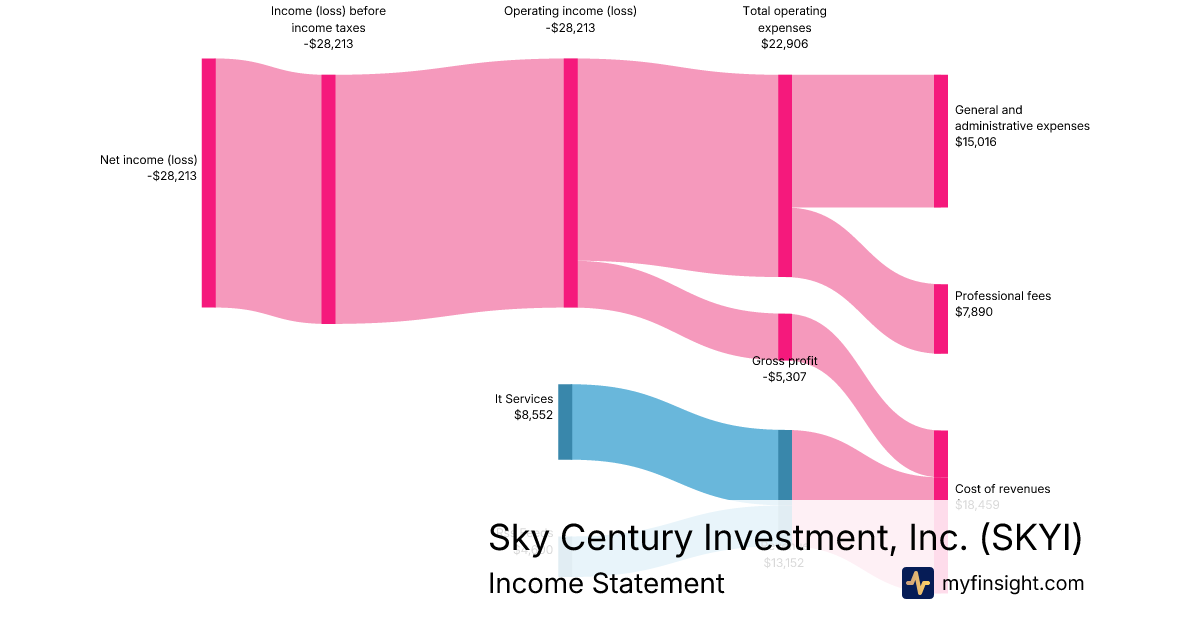 For the quarter ending 2025-11-30, SKYI made $13,152 in revenue. -$28,213 in net income. Net profit margin of -214.51%.