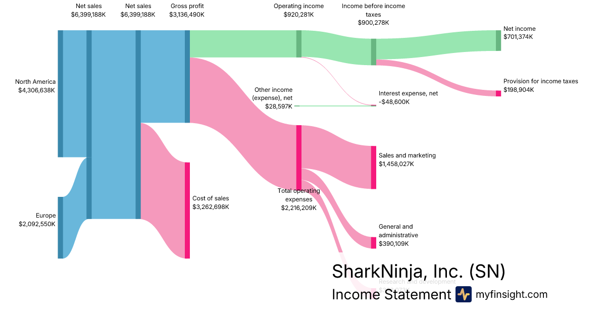 For the year ending 2025-12-31, SN made $6,399,188K in revenue. $701,374K in net income. Net profit margin of 10.96%.