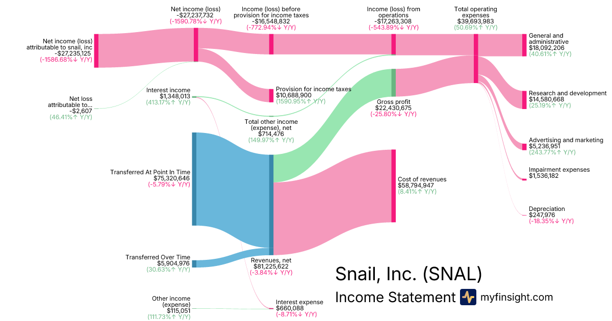 For the year ending 2025-12-31, SNAL made $81,225,622 in revenue. -$27,235,125 in net income. Net profit margin of -33.53%.