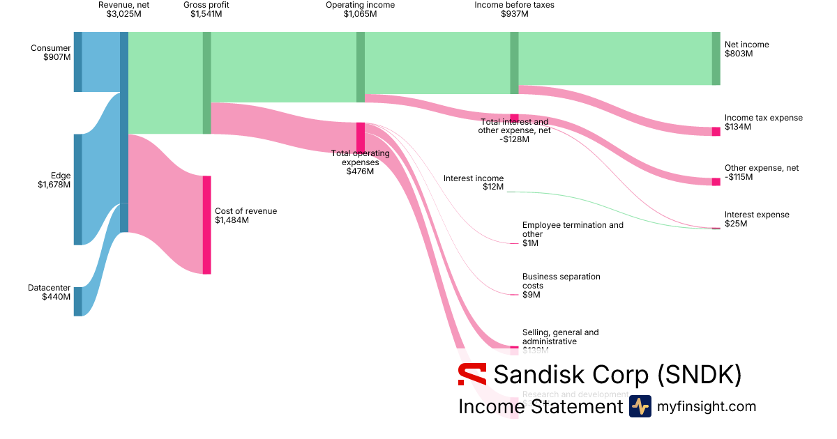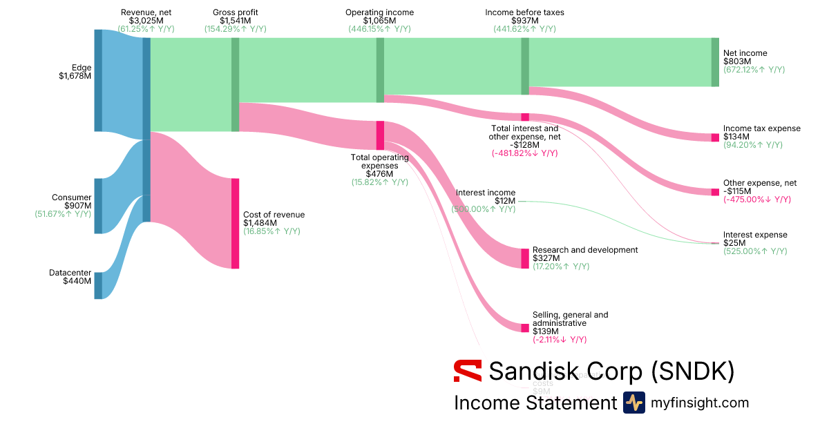 For the quarter ending 2026-01-02, SNDK made $3,025M in revenue. $803M in net income. Net profit margin of 26.55%.