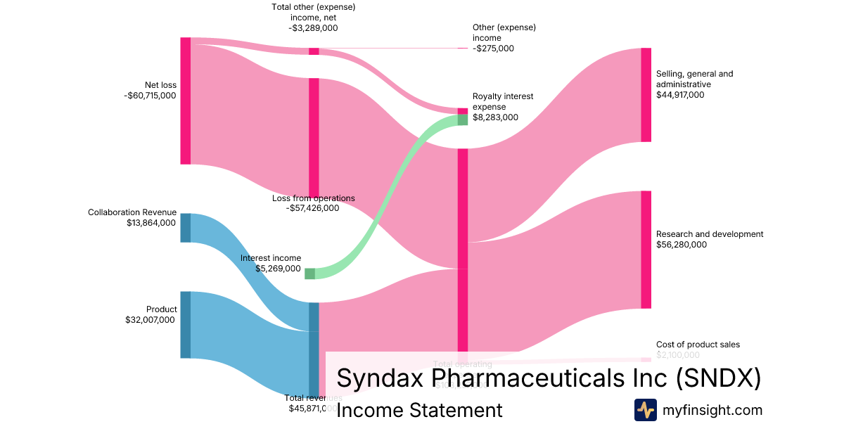 For the quarter ending 2025-09-30, SNDX made $45,871,000 in revenue. -$60,715,000 in net income. Net profit margin of -132.36%.