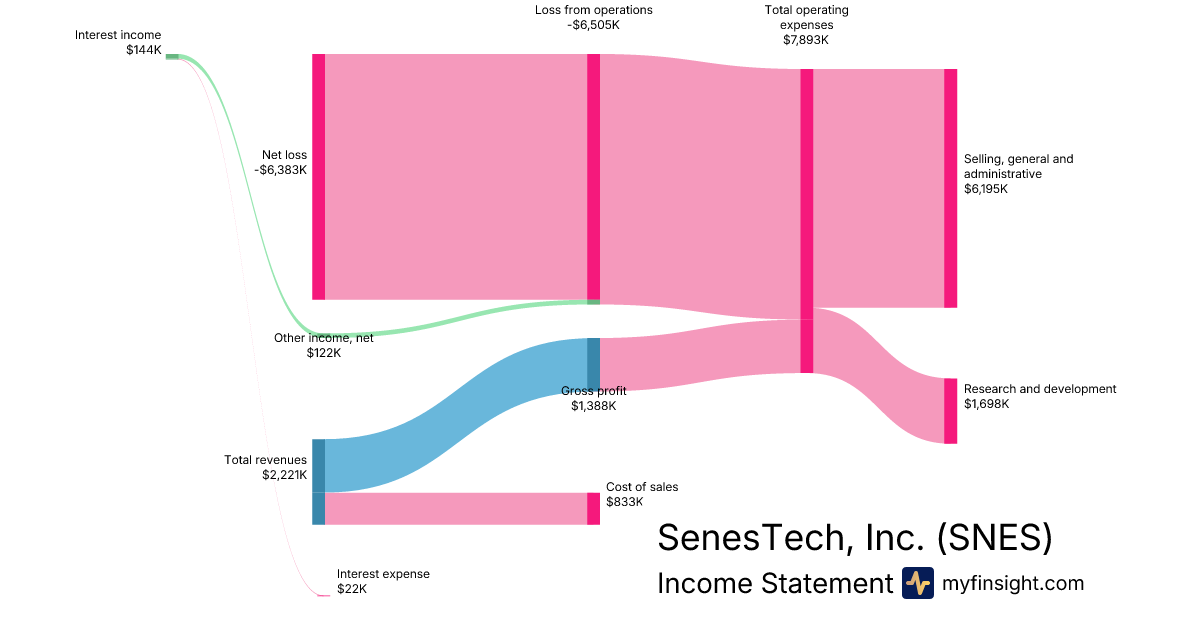 For the year ending 2025-12-31, SNES made $2,221K in revenue. -$6,383K in net income. Net profit margin of -287.39%.