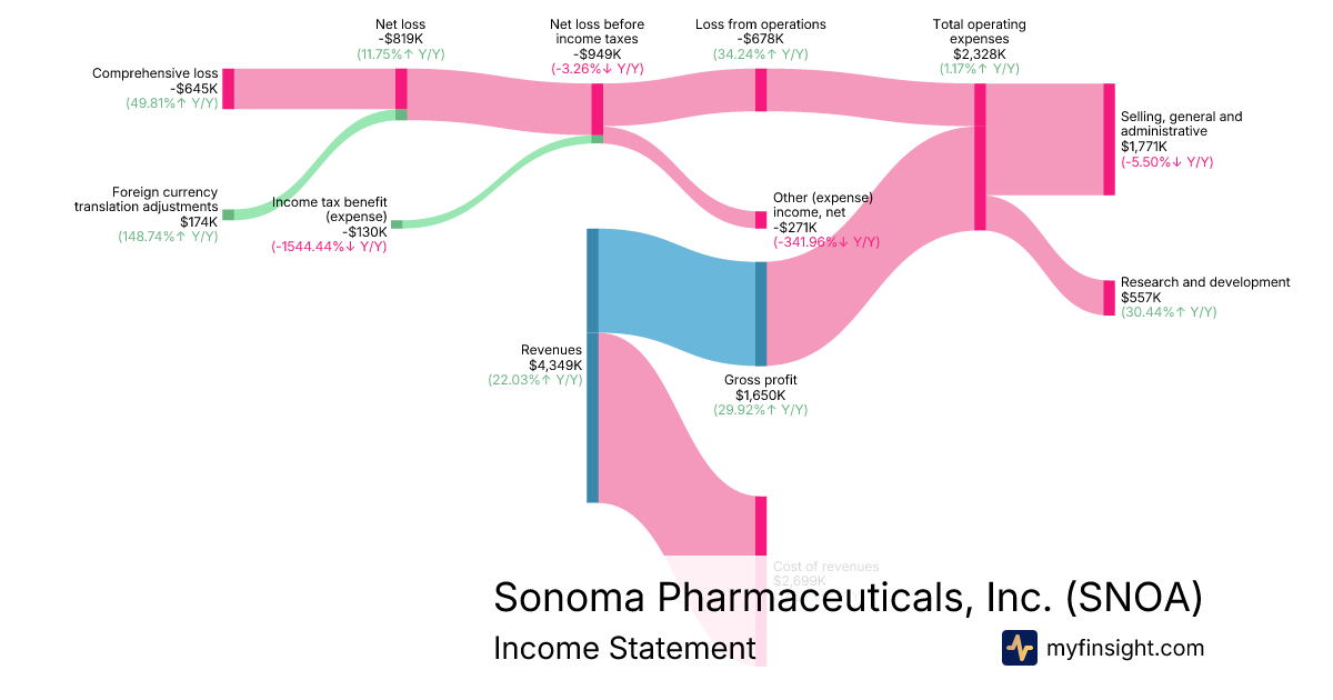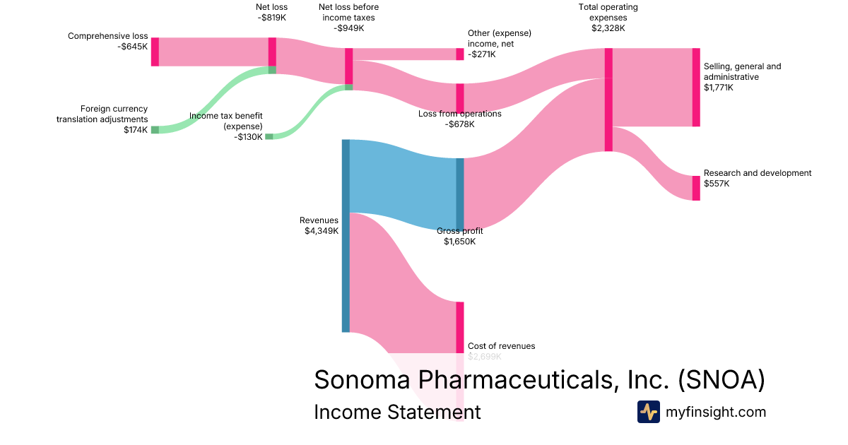 For the quarter ending 2025-12-31, SNOA made $4,349K in revenue. -$645K in net income. Net profit margin of -14.83%.