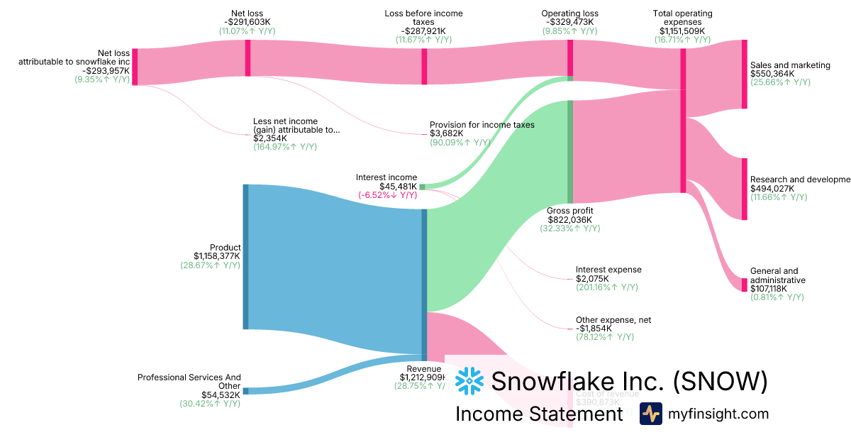 For the quarter ending 2025-10-31, SNOW made $1,212,909K in revenue. -$293,957K in net income. Net profit margin of -24.24%.