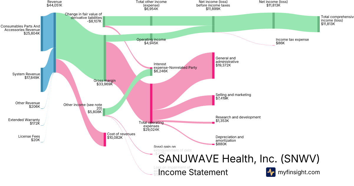 For the year ending 2025-12-31, SNWV made $44,051K in revenue. $11,813K in net income. Net profit margin of 26.82%.