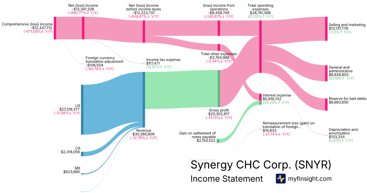 For the year ending 2025-12-31, SNYR made $30,380,809 in revenue. -$12,447,712 in net income. Net profit margin of -40.97%.