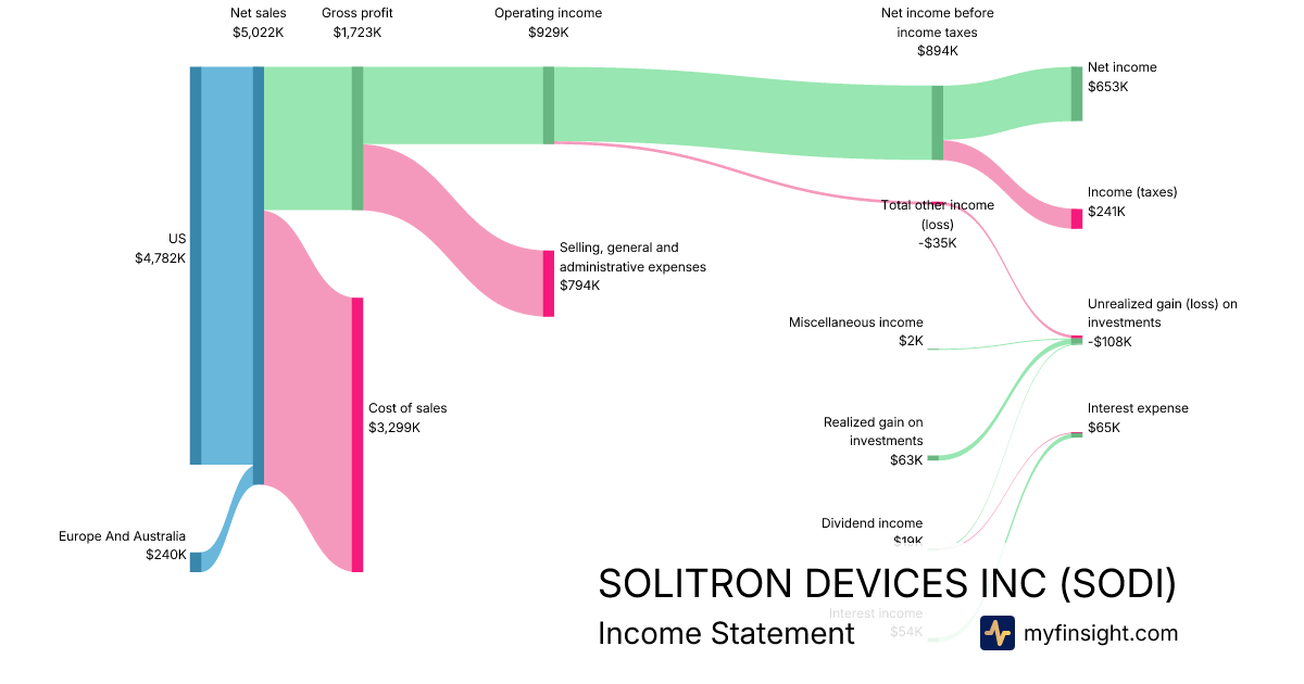 For the quarter ending 2025-11-30, SODI made $5,022K in revenue. $653K in net income. Net profit margin of 13.00%.