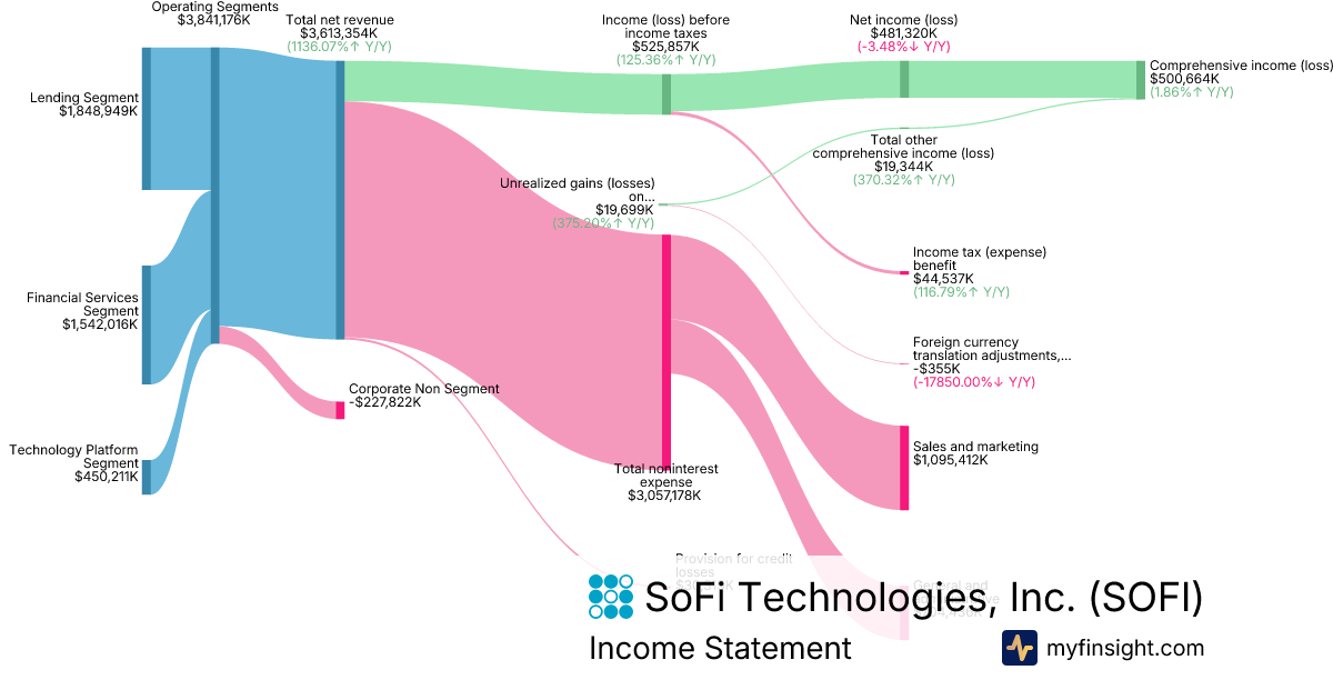 For the year ending 2025-12-31, SOFI made $3,613,354K in revenue. $500,664K in net income. Net profit margin of 13.86%.