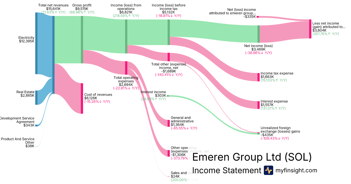 For the quarter ending 2025-09-30, SOL made $15,641K in revenue. -$335K in net income. Net profit margin of -2.14%.