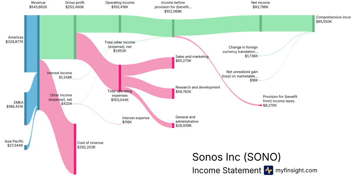 For the quarter ending 2025-12-27, SONO made $545,662K in revenue. $95,550K in net income. Net profit margin of 17.51%.