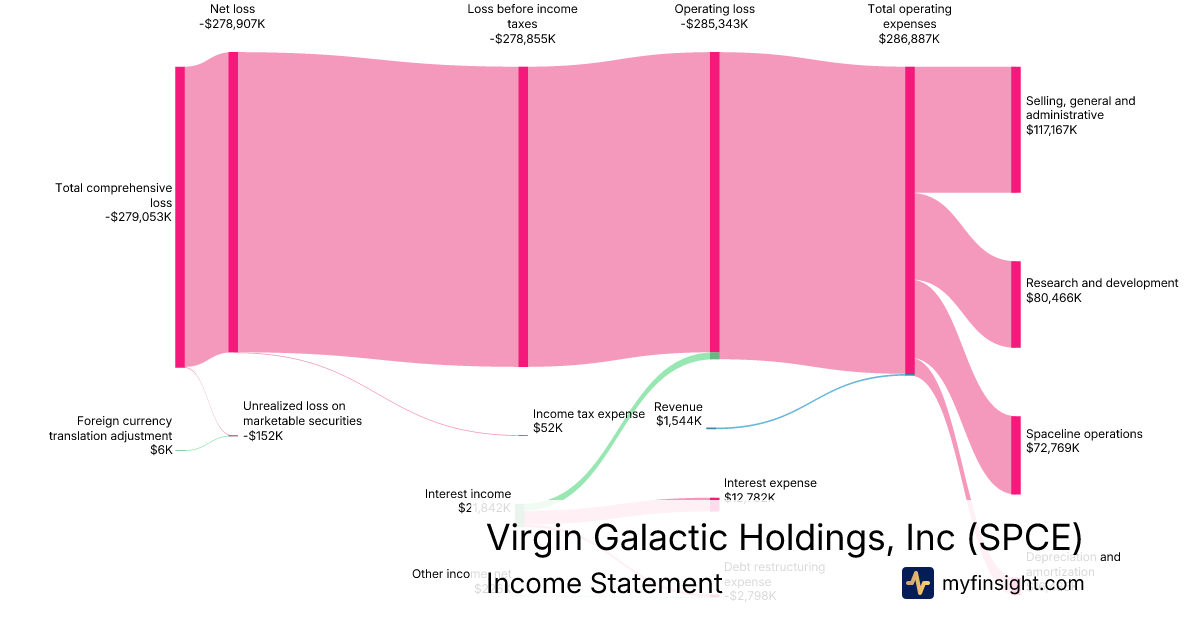For the year ending 2025-12-31, SPCE made $1,544K in revenue. -$279,053K in net income. Net profit margin of -18073.38%.