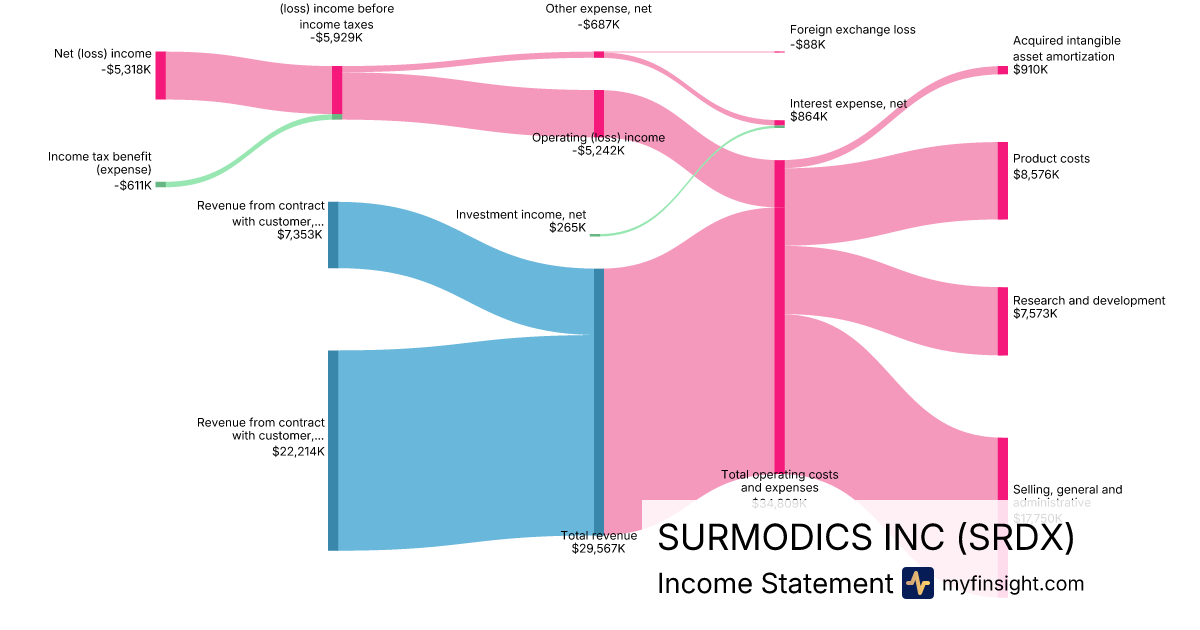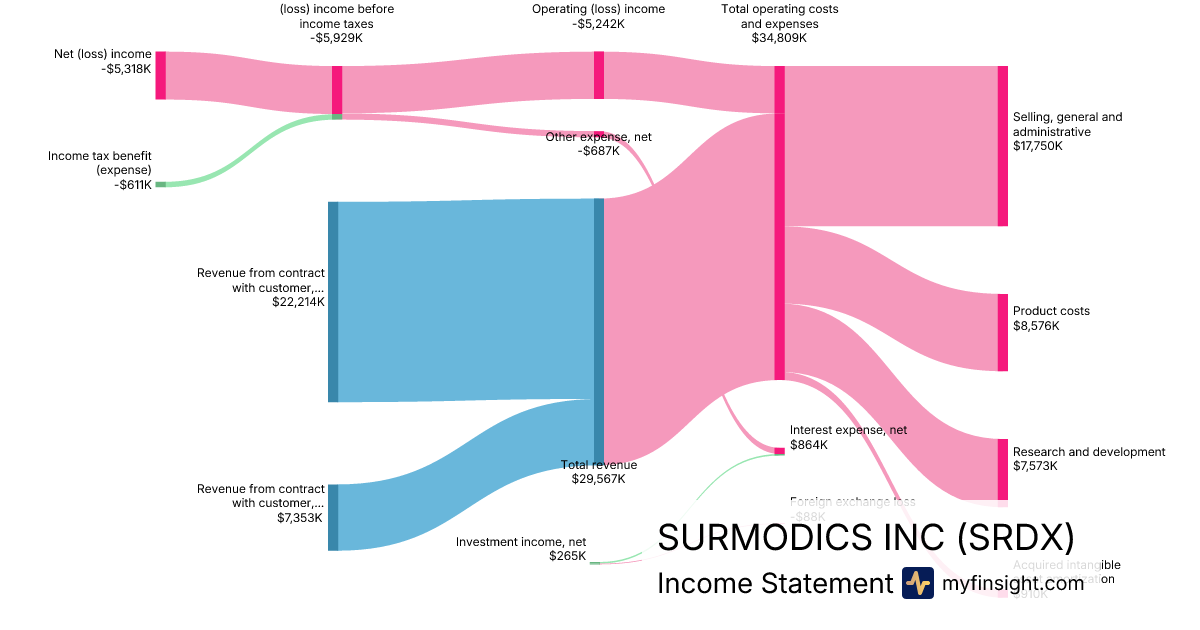 For the quarter ending 2025-06-30, SRDX made $29,567K in revenue. -$5,318K in net income. Net profit margin of -17.99%.