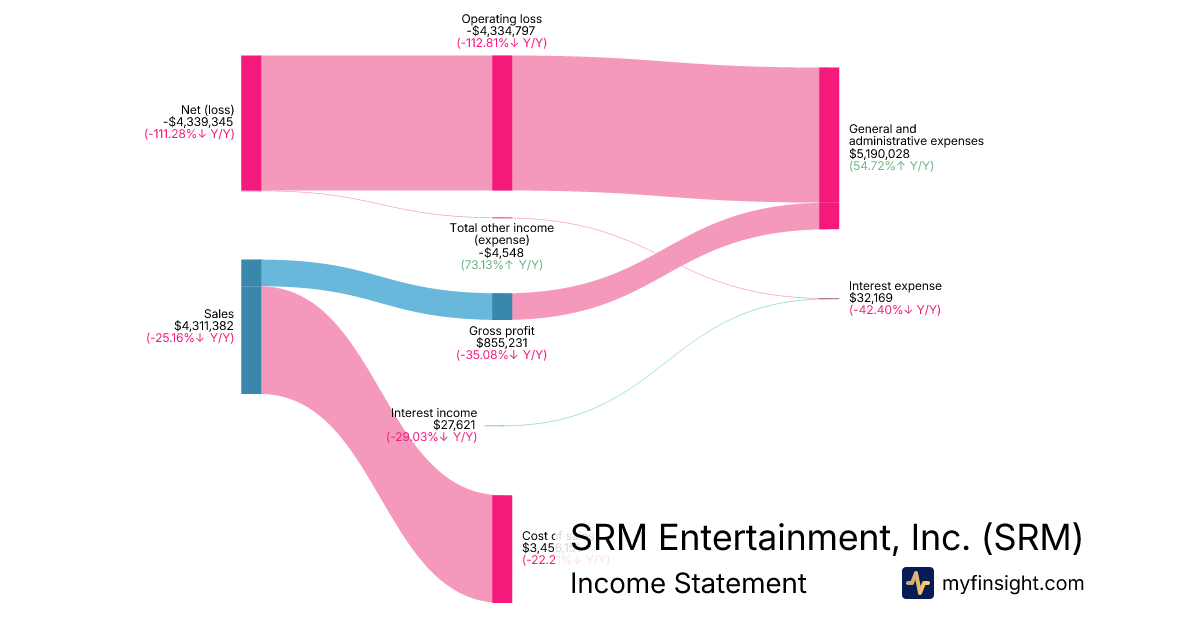 For the year ending 2024-12-31, SRM made $4,311,382 in revenue. -$4,339,345 in net income. Net profit margin of -100.65%.