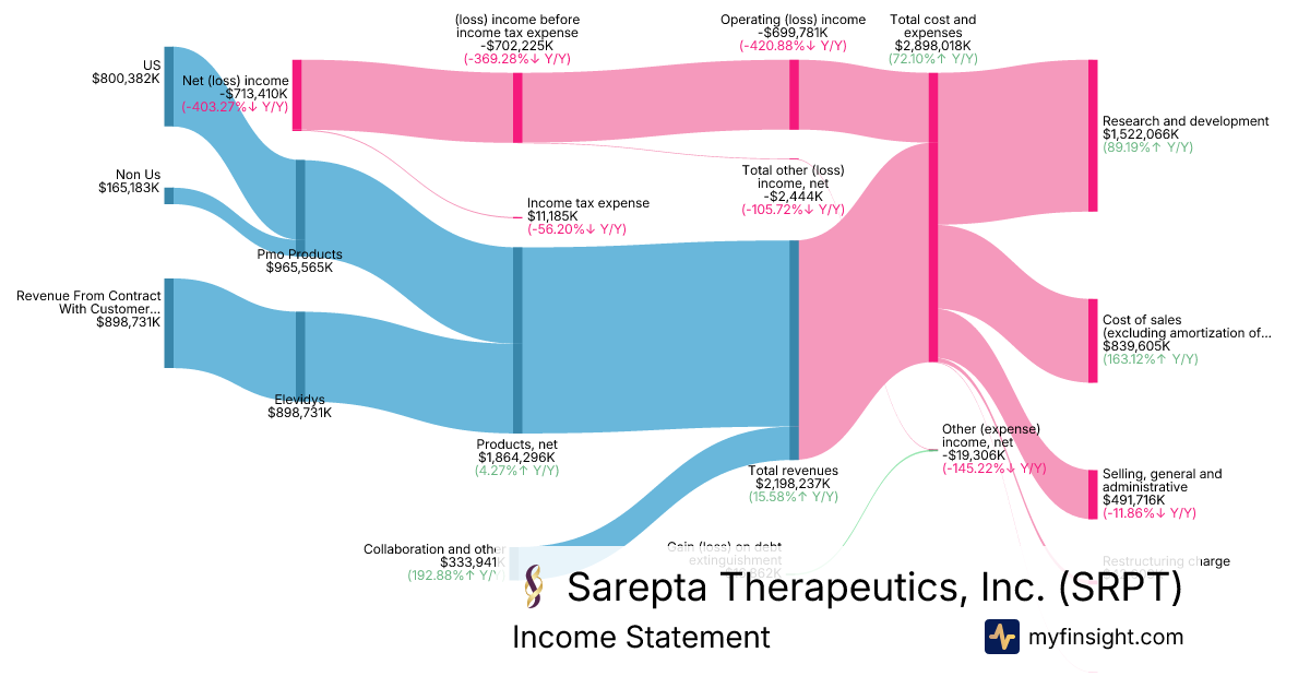 For the year ending 2025-12-31, SRPT made $2,198,237K in revenue. -$713,410K in net income. Net profit margin of -32.45%.