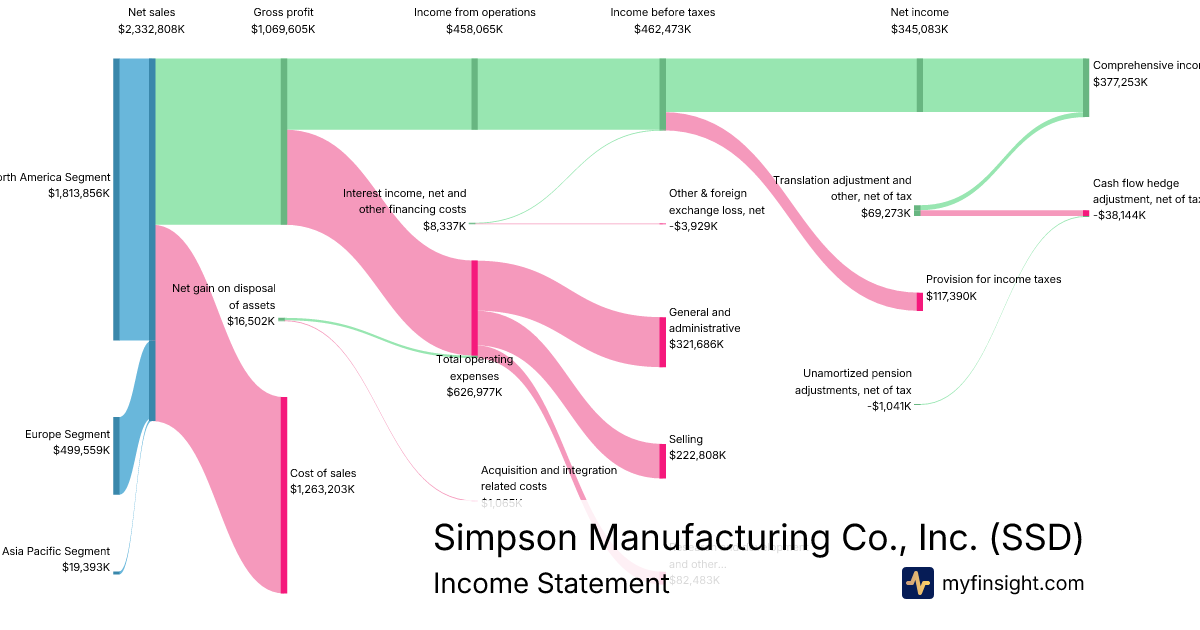 For the year ending 2025-12-31, SSD made $2,332,808K in revenue. $377,253K in net income. Net profit margin of 16.17%.