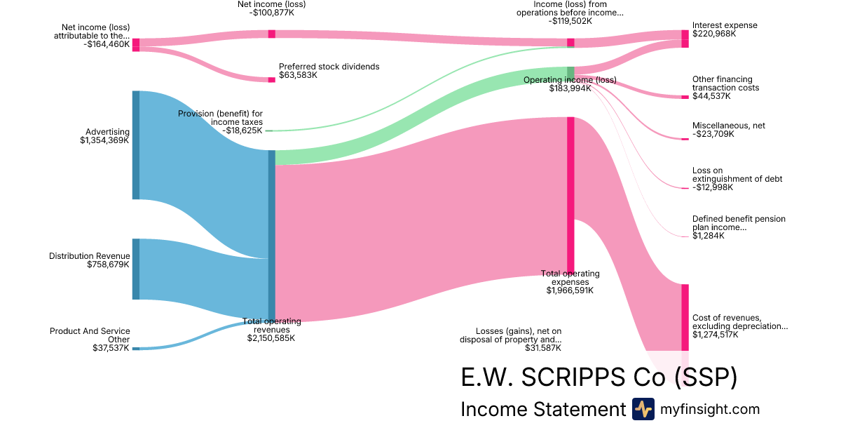 For the year ending 2025-12-31, SSP made $2,150,585K in revenue. -$164,460K in net income. Net profit margin of -7.65%.