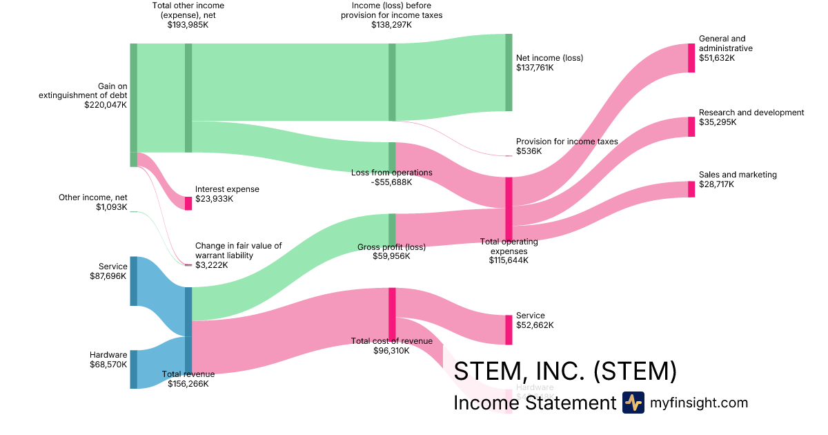 For the year ending 2025-12-31, STEM made $156,266K in revenue. $137,761K in net income. Net profit margin of 88.16%.