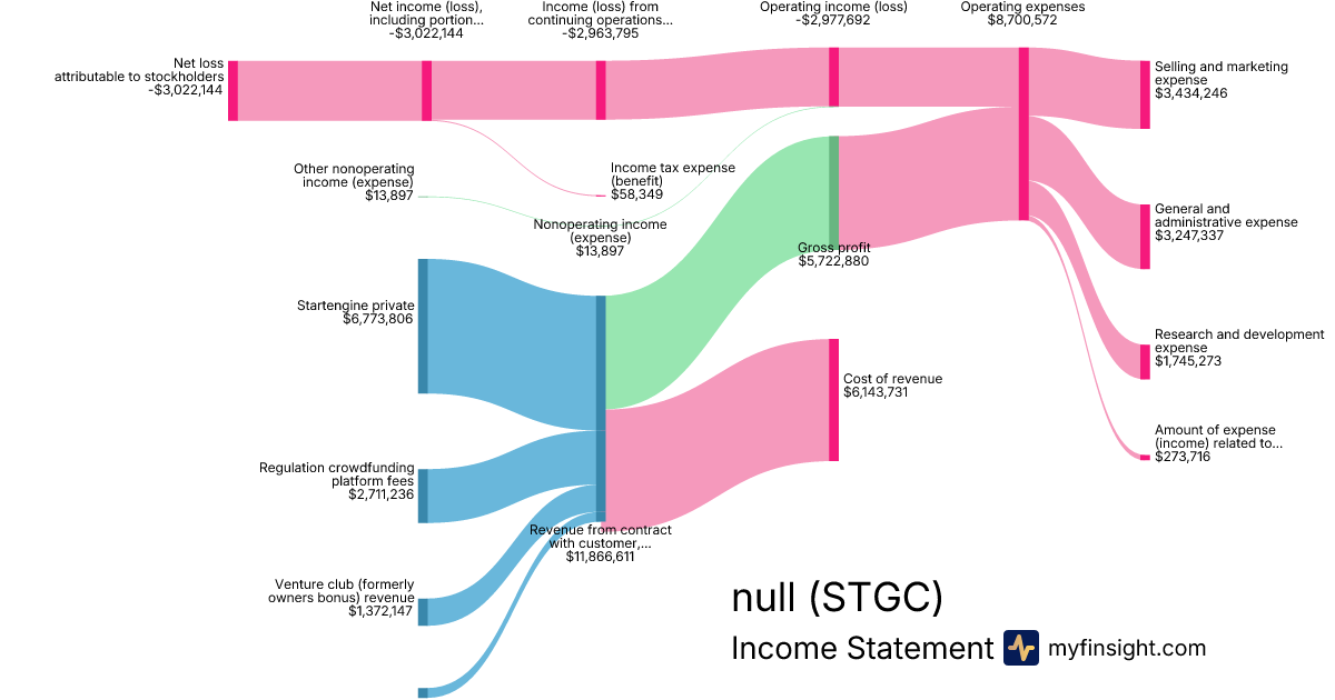 For the quarter ending 2024-06-30, STGC made $11,866,611 in revenue. -$3,022,144 in net income. Net profit margin of -25.47%.
