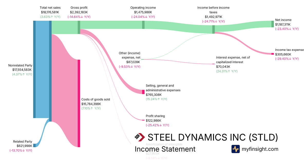 For the year ending 2025-12-31, STLD made $18,176,581K in revenue. $1,187,311K in net income. Net profit margin of 6.53%.