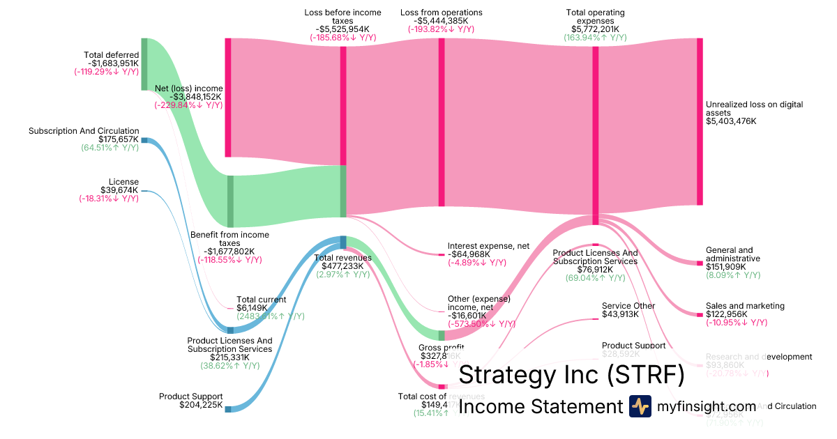 For the year ending 2025-12-31, STRF made $477,233K in revenue. -$3,848,152K in net income. Net profit margin of -806.35%.