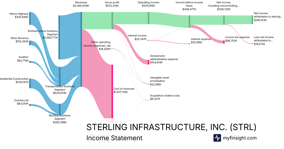 For the year ending 2025-12-31, STRL made $2,490,049K in revenue. $290,153K in net income. Net profit margin of 11.65%.