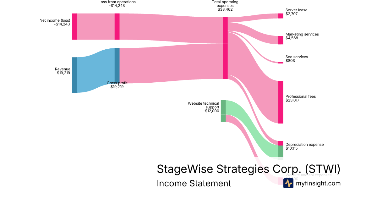 For the quarter ending 2025-12-31, STWI made $19,219 in revenue. -$14,243 in net income. Net profit margin of -74.11%.