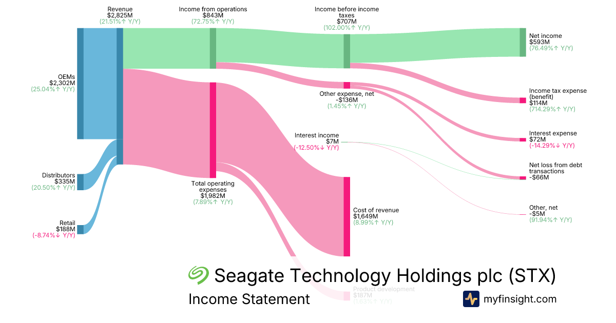 For the quarter ending 2026-01-02, STX made $2,825M in revenue. $593M in net income. Net profit margin of 20.99%.