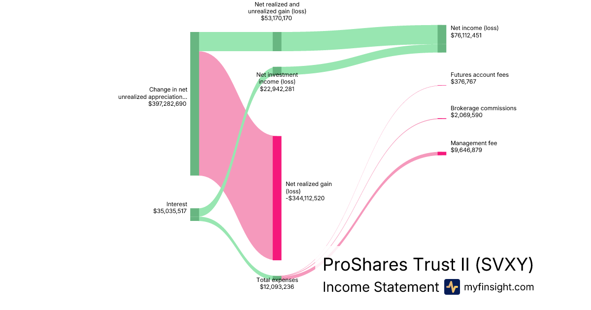 For the quarter ending 2025-09-30, SVXY made $444,411,443 in revenue. $76,112,451 in net income. Net profit margin of 17.13%.