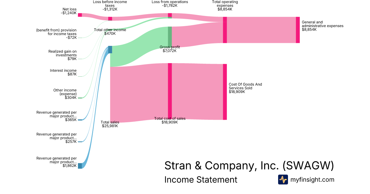 For the quarter ending 2025-09-30, SWAGW made $25,981K in revenue. -$1,240K in net income. Net profit margin of -4.77%.