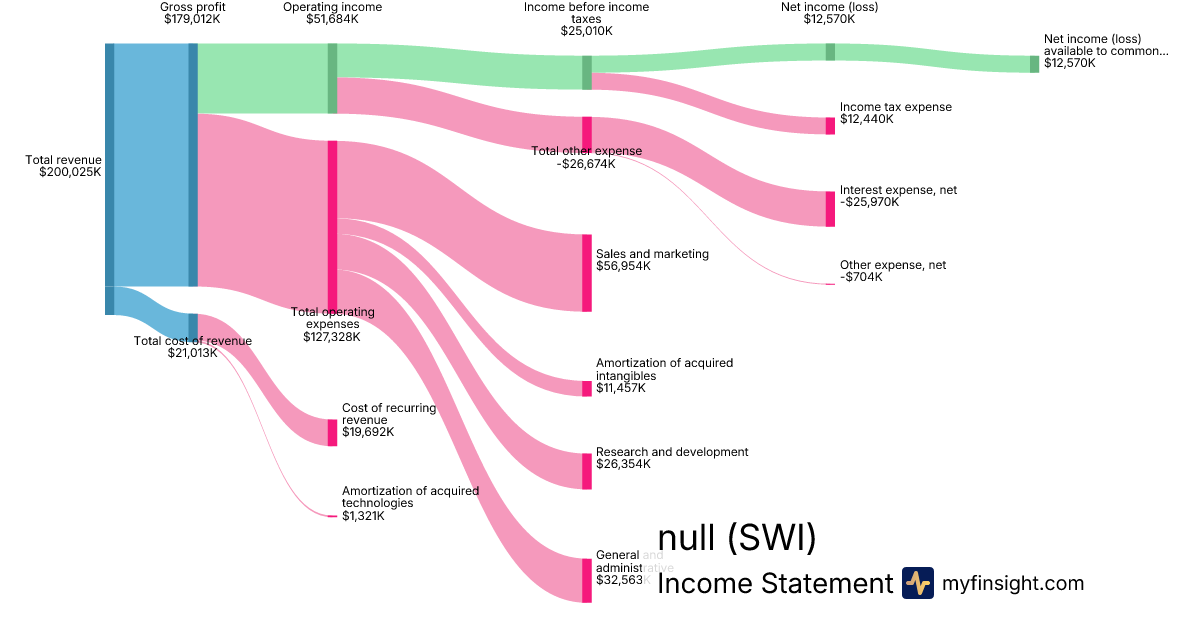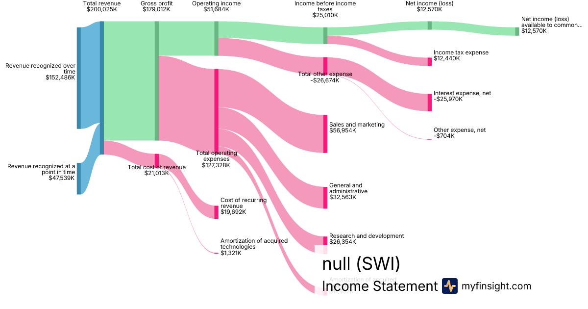 For the quarter ending 2024-09-30, SWI made $200,025K in revenue. $12,570K in net income. Net profit margin of 6.28%.