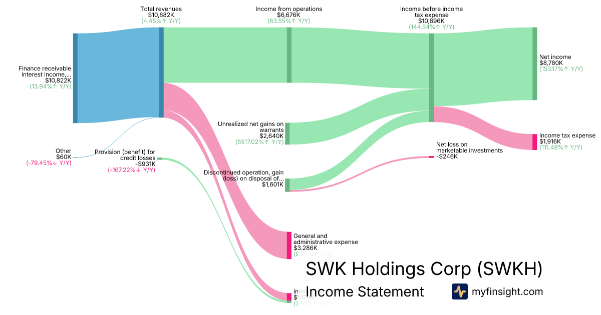 For the quarter ending 2025-09-30, SWKH made $10,882K in revenue. $8,780K in net income. Net profit margin of 80.68%.