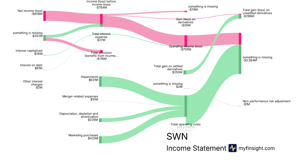 For the quarter ending 2024-06-30, SWN made $1,083M in revenue. -$608M in net income. Net profit margin of -56.14%.
