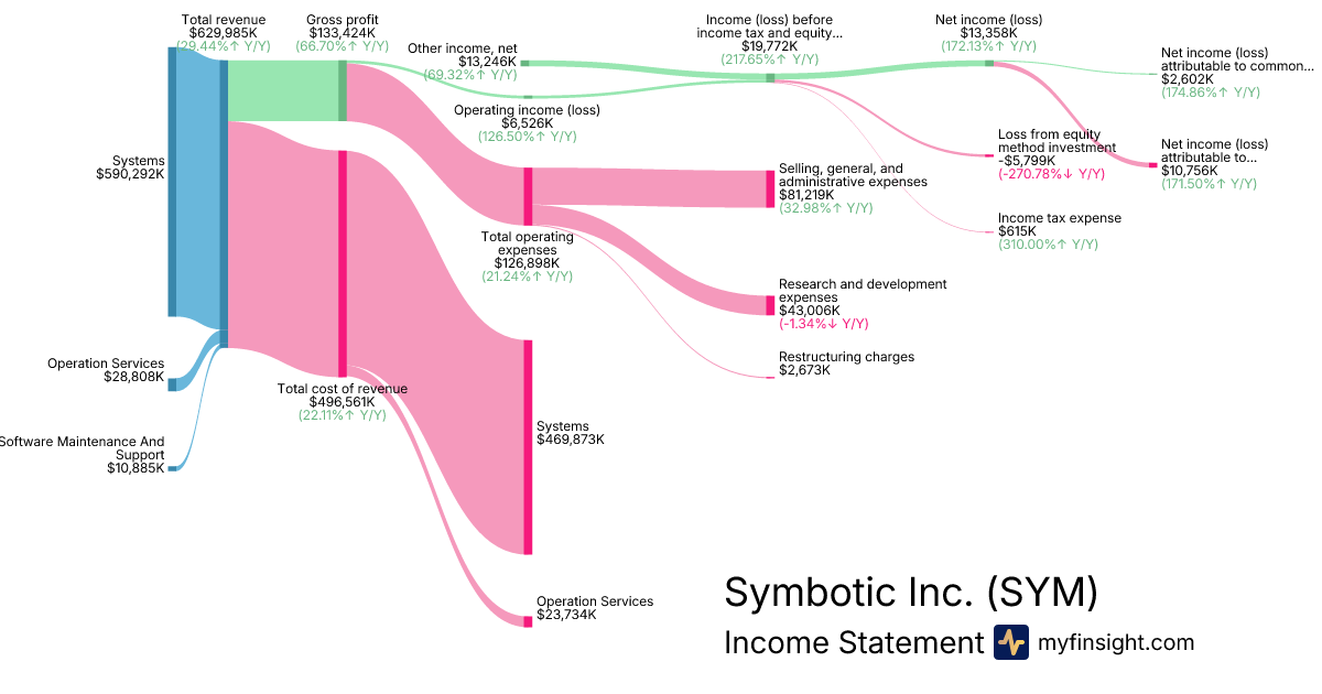 For the quarter ending 2025-12-27, SYM made $629,985K in revenue. $2,602K in net income. Net profit margin of 0.41%.