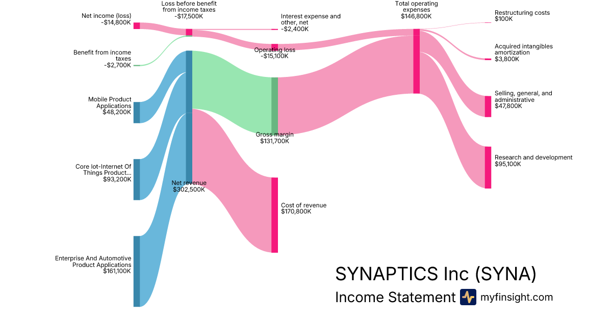 For the quarter ending 2025-12-27, SYNA made $302,500K in revenue. -$14,800K in net income. Net profit margin of -4.89%.