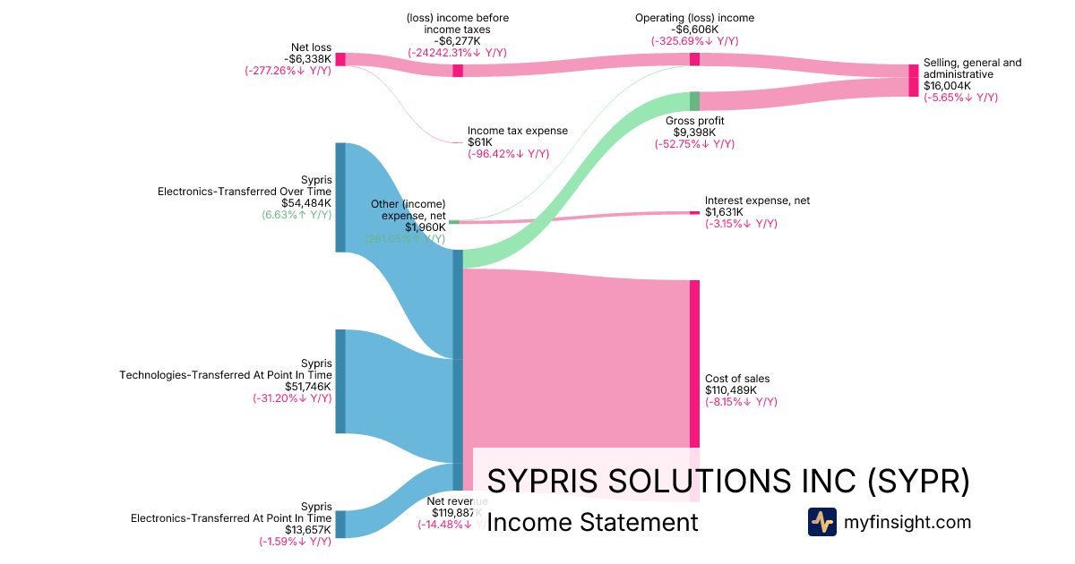 For the year ending 2025-12-31, SYPR made $119,887K in revenue. -$6,338K in net income. Net profit margin of -5.29%.