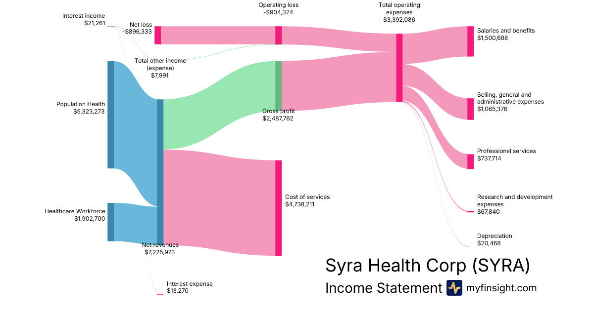 For the year ending 2025-12-31, SYRA made $7,225,973 in revenue. -$896,333 in net income. Net profit margin of -12.40%.