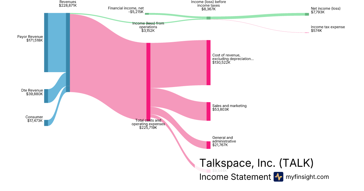 For the year ending 2025-12-31, TALK made $228,871K in revenue. $7,793K in net income. Net profit margin of 3.40%.