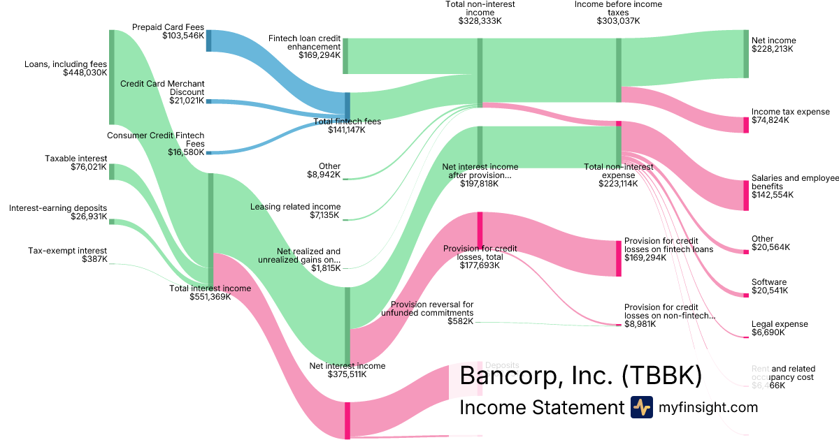 For the year ending 2025-12-31, TBBK made $141,147K in revenue. $228,213K in net income. Net profit margin of 161.68%.