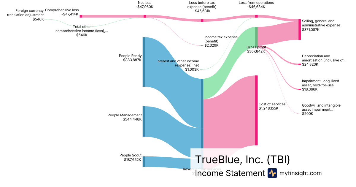 For the year ending 2025-12-28, TBI made $1,615,997K in revenue. -$47,414K in net income. Net profit margin of -2.93%.
