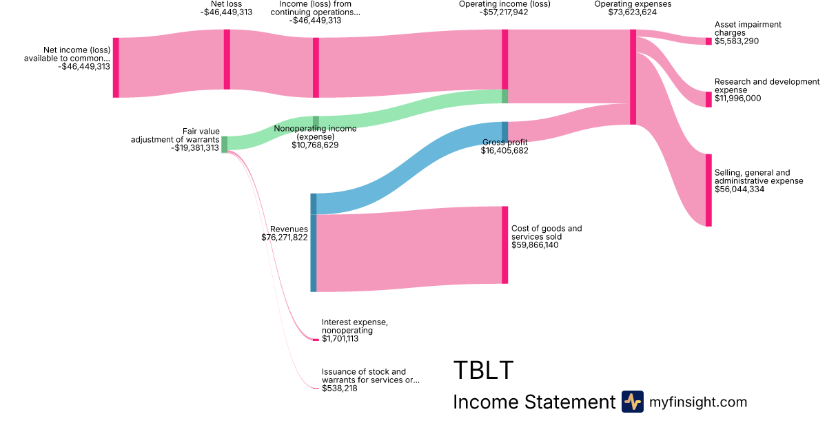 For the year ending 2023-12-31, TBLT made $76,271,822 in revenue. -$46,449,313 in net income. Net profit margin of -60.90%.