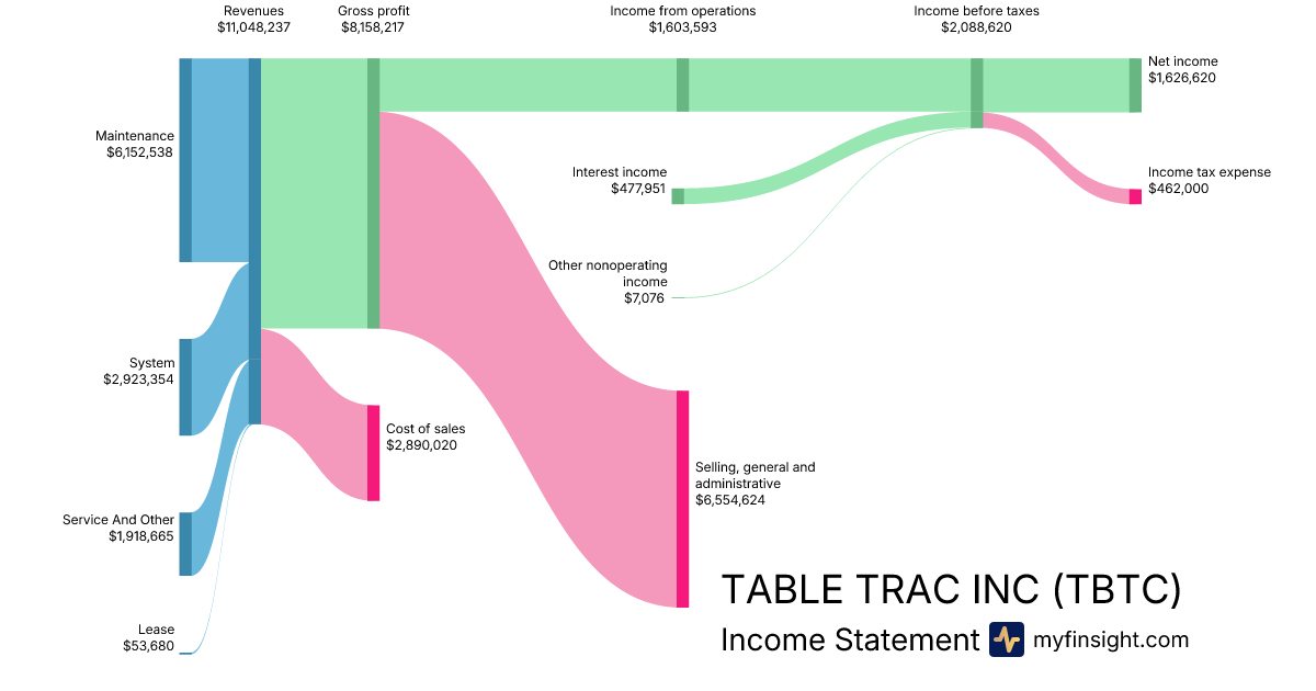 For the year ending 2025-12-31, TBTC made $11,048,237 in revenue. $1,626,620 in net income. Net profit margin of 14.72%.