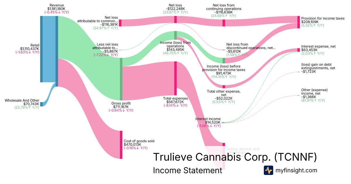 For the year ending 2025-12-31, TCNNF made $1,181,180K in revenue. -$116,381K in net income. Net profit margin of -9.85%.