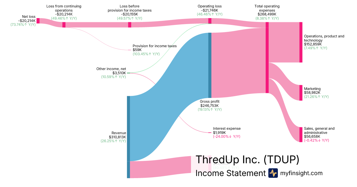 For the year ending 2025-12-31, TDUP made $310,813K in revenue. -$20,214K in net income. Net profit margin of -6.50%.