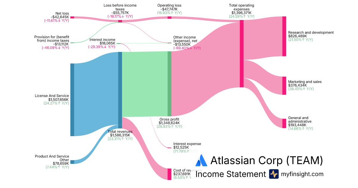 For the quarter ending 2025-12-31, TEAM made $1,586,315K in revenue. -$42,645K in net income. Net profit margin of -2.69%.