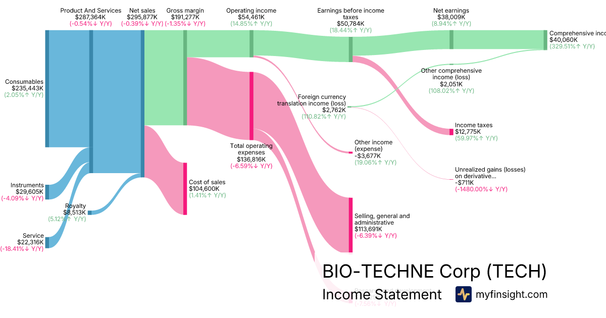 For the quarter ending 2025-12-31, TECH made $295,877K in revenue. $40,060K in net income. Net profit margin of 13.54%.