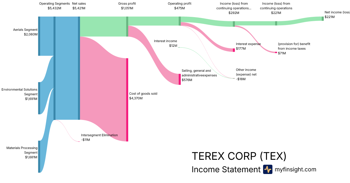 For the year ending 2025-12-31, TEX made $5,421M in revenue. $221M in net income. Net profit margin of 4.08%.