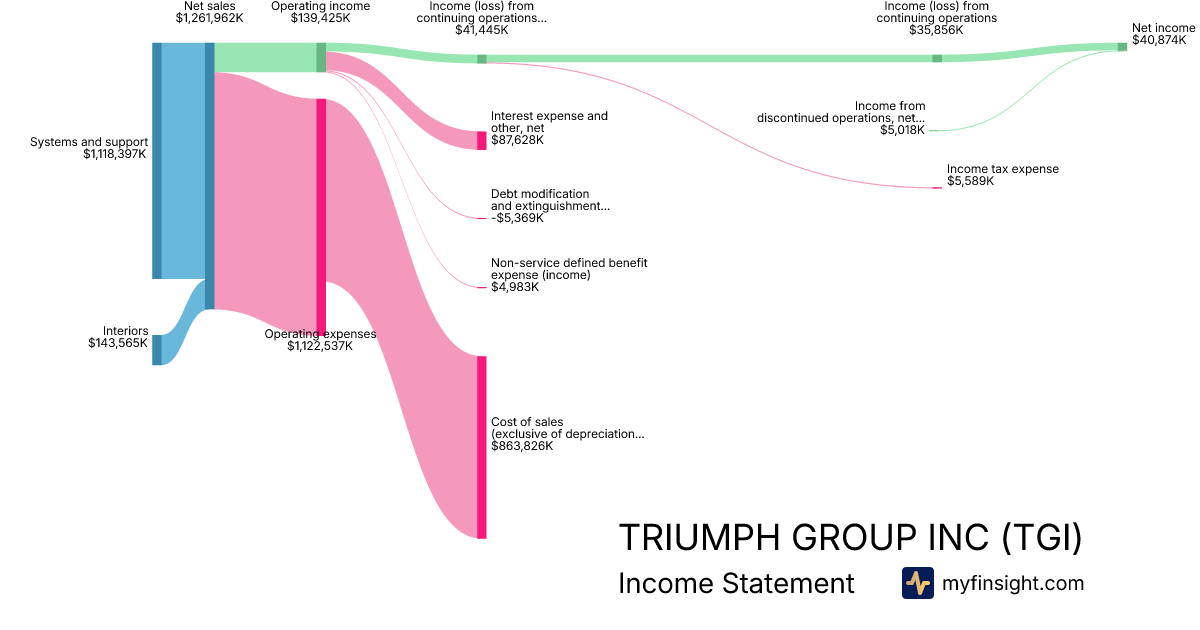 For the year ending 2025-03-31, TGI made $1,261,962K in revenue. $40,874K in net income. Net profit margin of 3.24%.