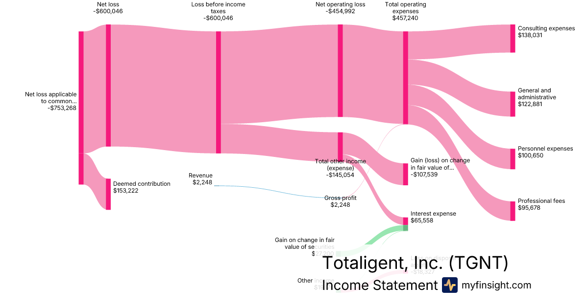For the year ending 2025-12-31, TGNT made $2,248 in revenue. -$753,268 in net income. Net profit margin of -33508.36%.