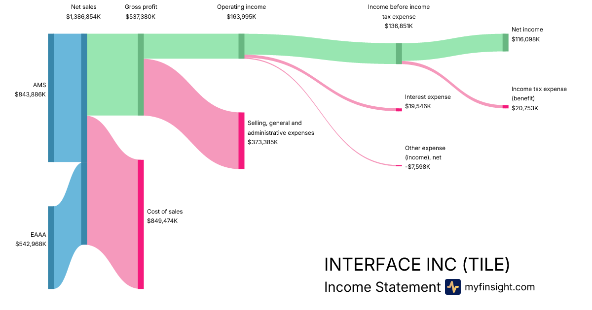 For the year ending 2025-12-28, TILE made $1,386,854K in revenue. $116,098K in net income. Net profit margin of 8.37%.